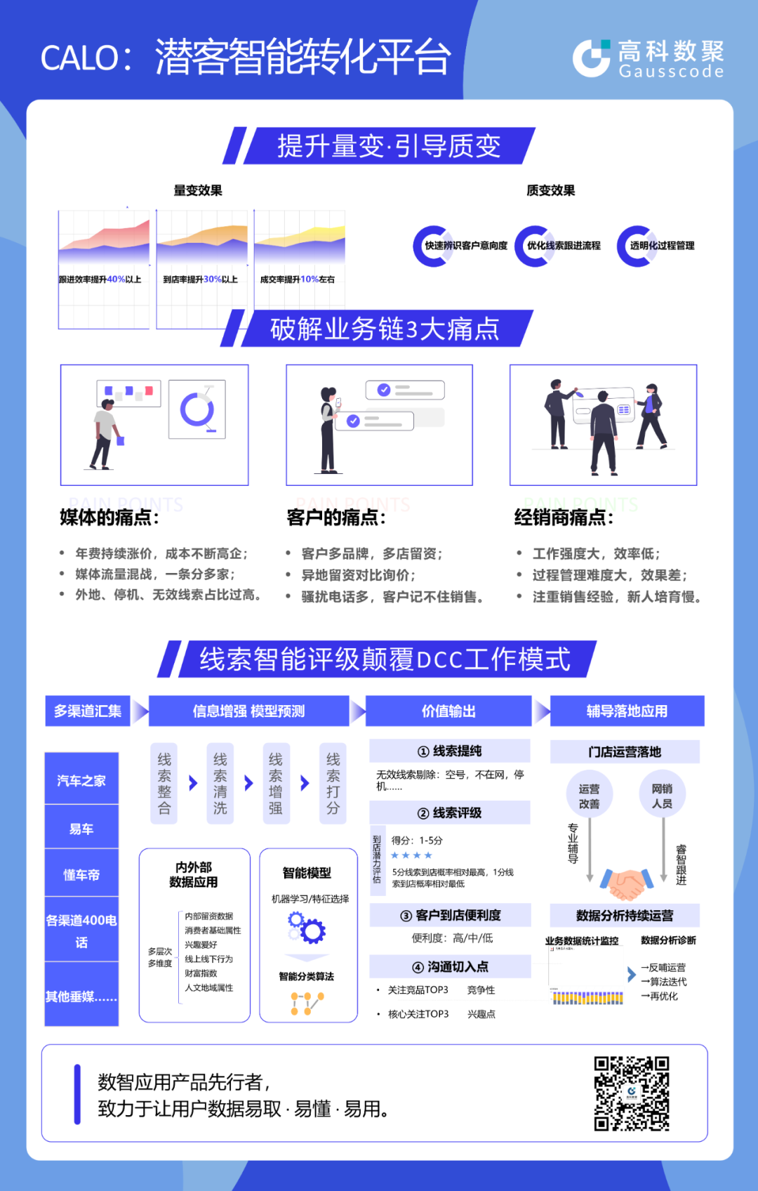 CALO围绕DCC流程、首呼邀约、线索跟进、线索等级判断、战败线索管理和挽回、销售趋势预警等6大板块发布高效且有保障的经销商智能运营方案,切实的解决销售线索无效、线索购买昂贵、线索转化效率低等难题。